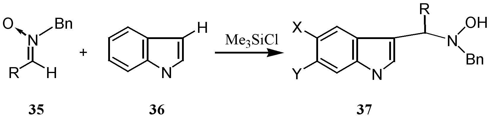 Недавно был разработан метод активации нитронов, позволяющий вводить их в реакцию с такими низкореакционноспособными С-нуклеофилами, как индолы.31 Длительное кипячение в органических растворителях нитрона 35 и индола 36 не приводит к образованию продуктов присоединения по нитроннной группе. Проведении реакции в присутствии (CH3)3SiCl позволяет получить продукт реакции 37 с выходом около 80 %. Error: Reference source not found