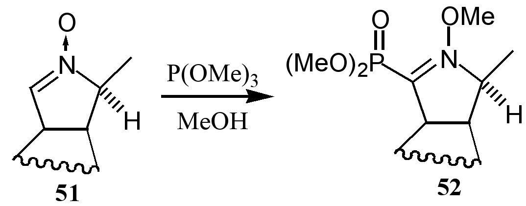 1.3 Взаимодействие с элеметоорганическими соединениями.Нуклеофильное присоединение к нитронам элементоорганических соединений приводит к образованию связи -углерод-гетероатом. Обнаружено, что в нейтральной среде (в метаноле) происходит нуклеофильное присоединение P(OMe)3 к нитрону 51, что приводит к фосфороорганическому соединению 52, а в уксусной кислоте происходит дезоксигенирование нитрона 53 - продуктом реакции является имин 54.33