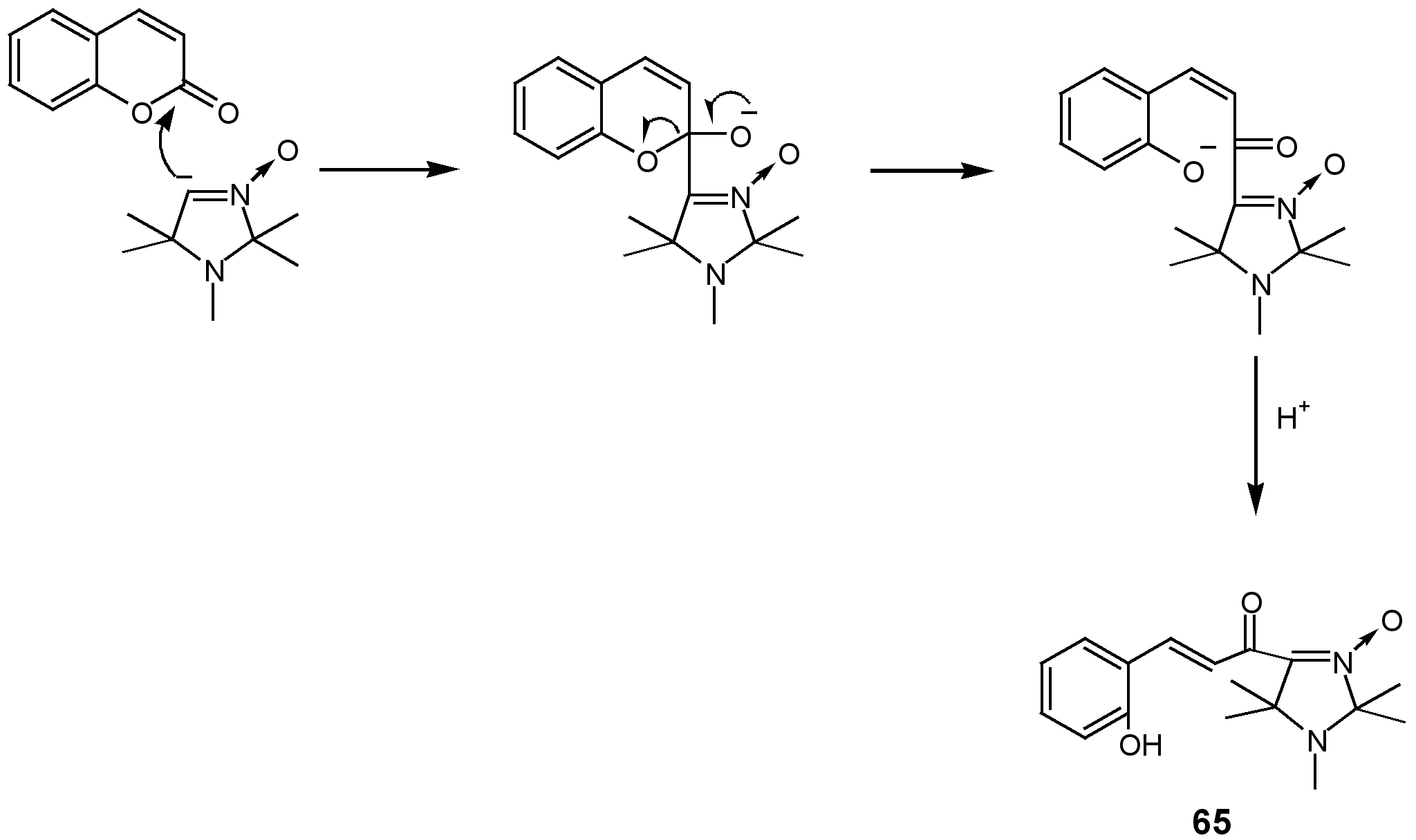 . Аналогичное взаимодействие в указанных выше условиях альдонитрона 59 - производного пирролин-1-оксида с окисью мезитила приводит к образованию 2-(2,2,4,4-тетраметилпирролин-1-оксид-2-ил)-бут-3-ен-2-ола 64 с выходом 83%. Литиирование альдонитрона 58 s-BuLi при -70 0С и последующая обработка раствором кумарина в диэтиловом эфире приводит к образованию соединения с ярко выраженной кислотной природой: продукт реакции не удалось проэкстрагировать из водной фазы при pH » 10-11, образующейся при разложении реакционной среды водой. Подкисление реакционной среды уксусной кислотой до pH » 3 приводит к изменению цвета реакционной смеси с интенсивного малинового до жёлтого. Экстракция из подкисленного раствора и последующая отгонка растворителя позволяет получить хроматографически чистый продукт жёлтого цвета. В ик-спектре полученного соединения, записанного в растворе СНCl3, наблюдается полоса при 3254 см-1, отнесённая к валентным колебаниям ОН группы, а также полосы колебаний при 1576, 1597, 1612 и 1640 см-1. Поскольку эта область характерна для валентных колебаний карбонильной группы, сопряженной с кратной связью, валентных колебаний нитронной группы и С=С связей ароматического кольца, однозначное отнесение полос колебаний затруднено. В спектре ЯМР 1Н полученного соединения, наряду с сигналами протонов геминальных метильных групп имидазолинового цикла и группы N-CH3 при 1.4, 1.5 и 2.4 м.д. соответственно, наблюдаются сигналы ароматических протонов в областях 7.6 – 7.9 м.д. и 7.1-7.5 м.д. Мультиплет с центром при 8.00 м.д., представляющий собой АВ-систему, был отнесен к резонансу протонов фрагмента H-C=C-H, а уширенный сигнал в области 7.6-7.8 м.д. был отнесён к резонансу протона ОН-группы. На основании полученных спектральных данных и данных элементного анализа полученному соединению была приписана структура 3-(2-гидроксифенил)-1-(1,2,2,5,5-пентаметил-3-имидазолин-3-оксид-4-ил)-пропенона 65. Таким образом, реакция с кумарином проходит по типу 1,2-нуклеофильного присоединения по карбонильной группе.