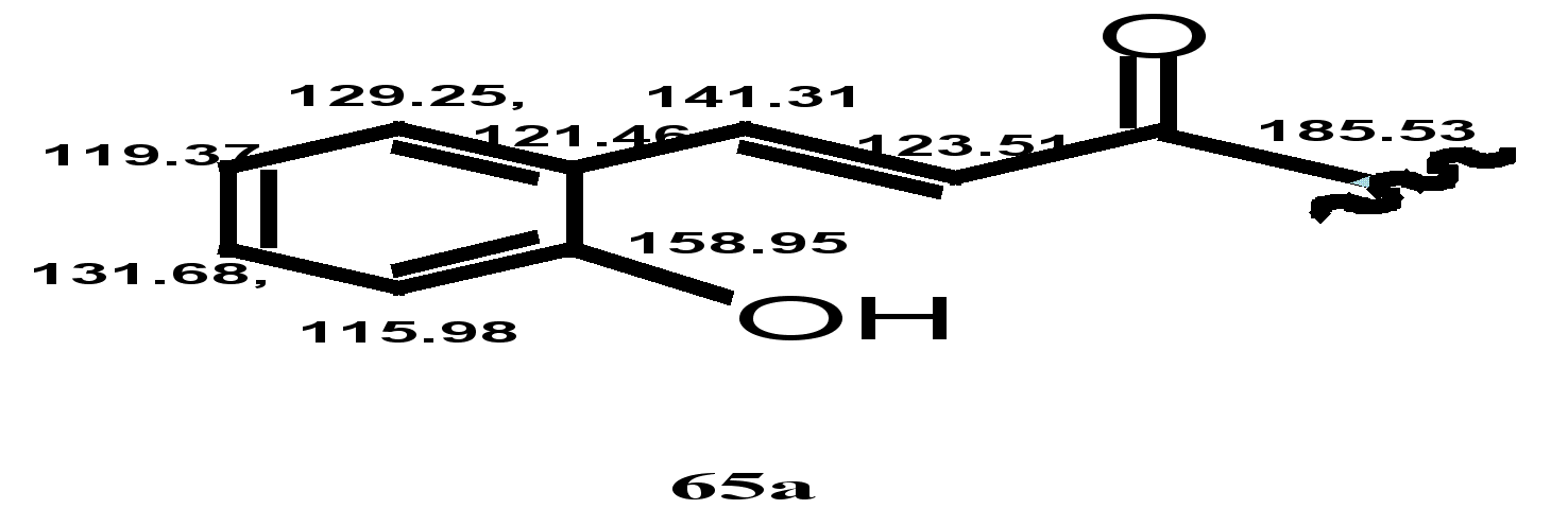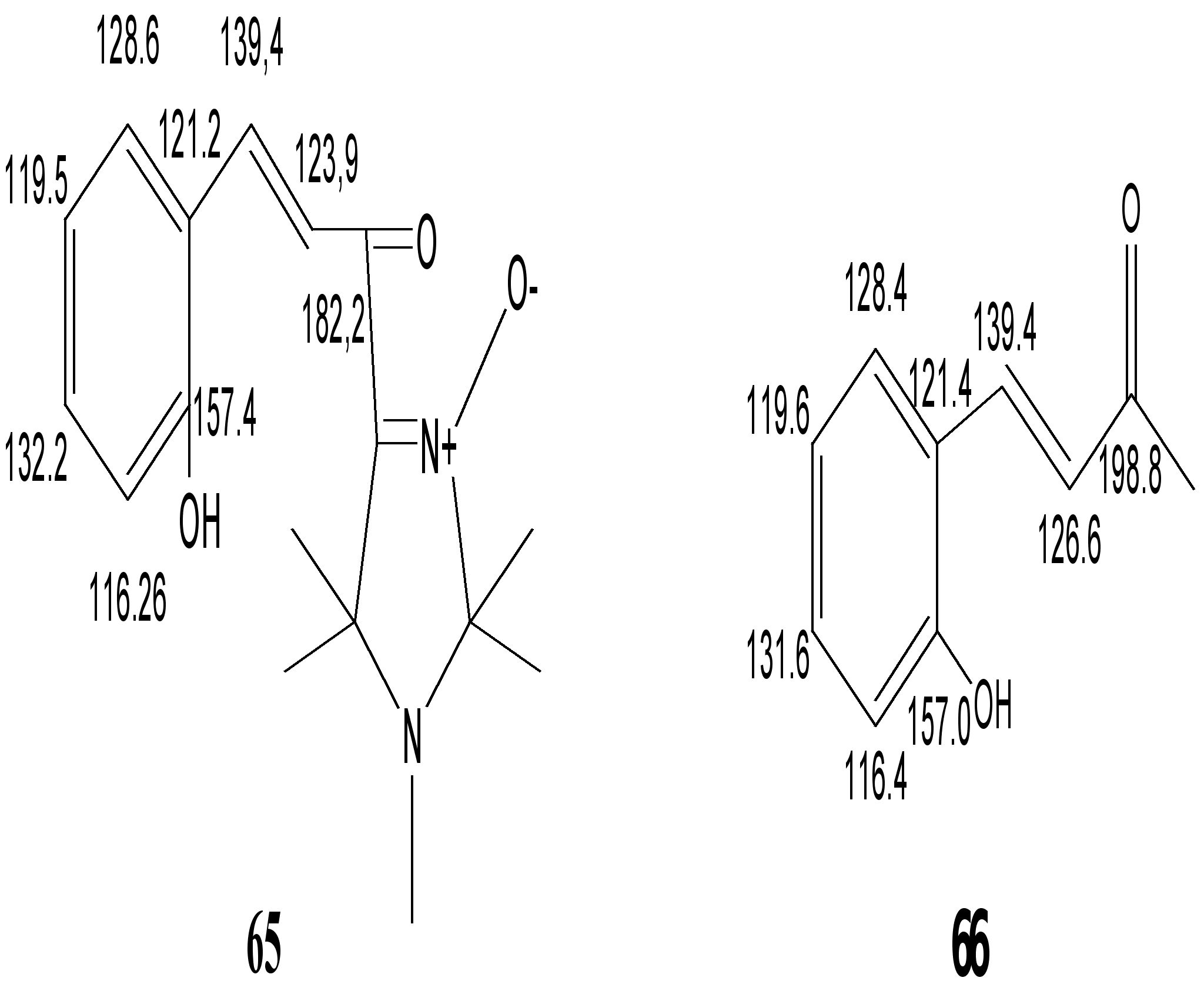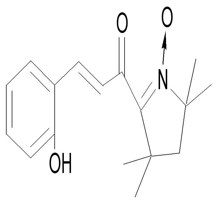 3-(2-Гидроксифенил)-1-(3,3,5,5-тетраметилпирролин-1-оксид-2-ил)-пропенон 65а. ЯМР 1Н (СDCl3, d, м.д.): 1.24 (c, 6H, CH3), 1.35 (c, 6H, 2CH3), 2.38 (c, 2H, 2CH3), 6.65 (д, 1Н, аром., J=7 Гц), 7.05 (т, 1H, аром., 2J=7 Гц), 7.61 (AB, 1Н, СН=СН, 3JHH=16 Гц), 7.95 (AB, 1Н, СН=СН, 3JHH=16 Гц). ЯМР 13C (СDCl3, d, м.д.): 27.11, 27.99 (4 CH3), 40.96 (СН2), 75.11 (С2), 115.98, 119.37, 121.46, 123.51, 129.25, 131.68, 141.31, 147.40 (С=N), 158.95 (Ar-ОН), 185.53 ( С=О).