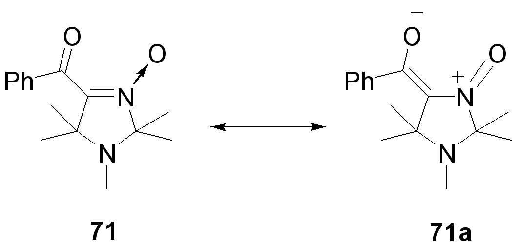 Таким образом, взаимодействие -литиированного производного нитрона с диметилформамидом является удобным и элегантным синтетическим методом получения -формилнитрона. При взаимодействии -литиированного производного нитрона 58 с хлористым бензоилом из реакционной смеси с выходом 87 % был выделен кристаллический продукт. В ЯМР 1Н спектре полученного соединения наряду с сигналами 5 метильных групп 3-имидазолин-3-оксидного фрагмента, наблюдаются сигналы в области 7.2-7.9 м.д., отнесённые к резонансу атомов водорода фенильной группы. В спектре ЯМР 13С присутствует характерный сигнал при 188.53 м.д., отнесённый к резонансу атома углерода карбонильной группы. Наличие интенсивной полосы колебаний в ИК спектре при 1651 см-1 также свидетельствует о присутствии в составе молекулы сопряжённой карбонильной группы. На основании данных элементного анализа и спектральной информации полученному соединению была приписана структура 1,2,2,5,5-пентаметил-4-бензоил-3-имидазолин-3-оксида 71.
