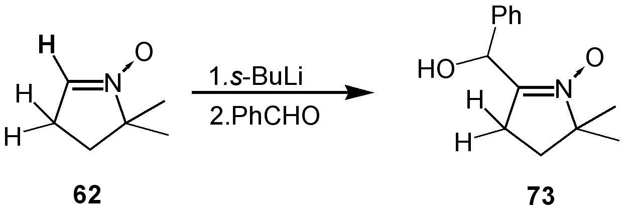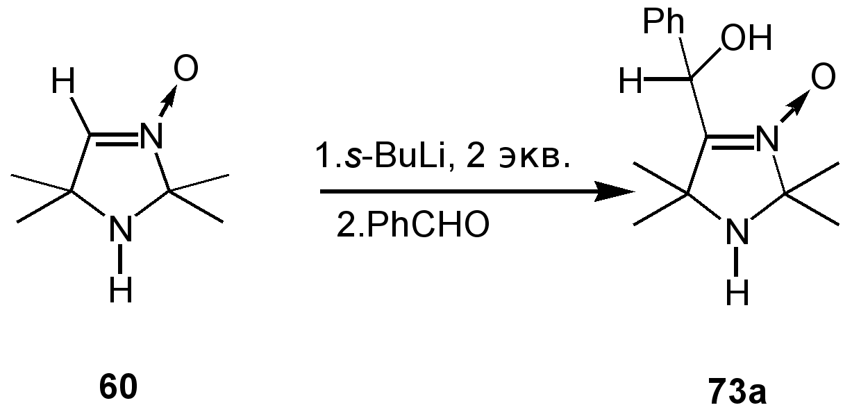 Образование продукта реакции 73 даёт нам основание утверждать, что при увеличении времени металлирования до 30 минут происходит образование термодинамически более стабильного продукта литиирования по альдонитронной группе, что даёт возможность селективно провести взаимодействие с электрофильным реагентом по альдонитронной группе на фоне кинетически более кислой метиленовой группы. В последовательность реакций металлирование-электрофильное замещение может быть введено производное 3-имидазолин-3-оксида 60, содержащее вторичную аминогруппу в первом положении имидазолинового цикла. В данном случае для литиирования альдонитрона было использовано два эквивалента s-BuLi. взаимодействие литиированного производного альдонитрона 60 с бензальдегидом с выходом 15 % приводит к образованию продукта нуклеофильного присоединения по карбонильной группе 73а.