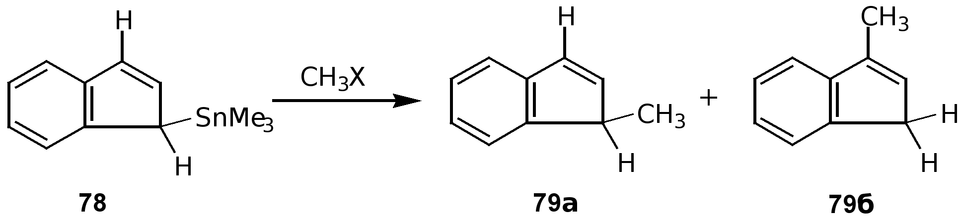 В реакции алкилдеметаллирования инденилтриметилстаннана 78 наряду с ожидаемым 1-метилинденом 79а образуется и некоторое количество 3-метилиндена 79б.