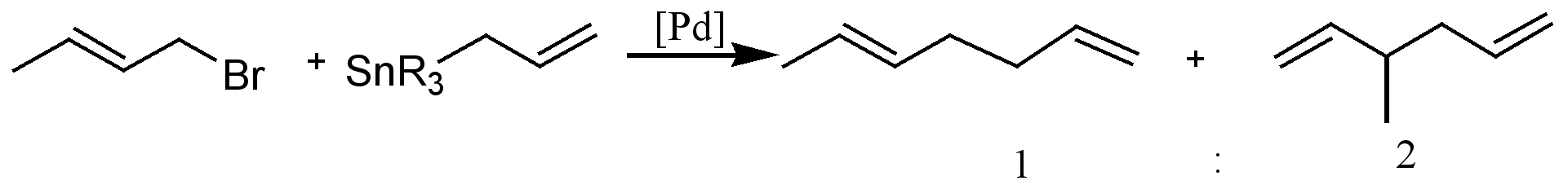Взаимодействие аллибромидов с аллилоловоорганическими реагентами осложняется образованием продуктов аллильной перегруппировки.47 Соотношение продуктов реакции принципиально можно изменить, варьируя заместители уходящей группы оловоорганического реагента, а также используя различные катализаторы, сокатализаторы и растворители.