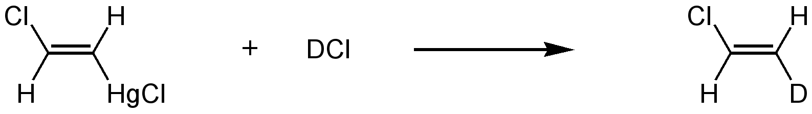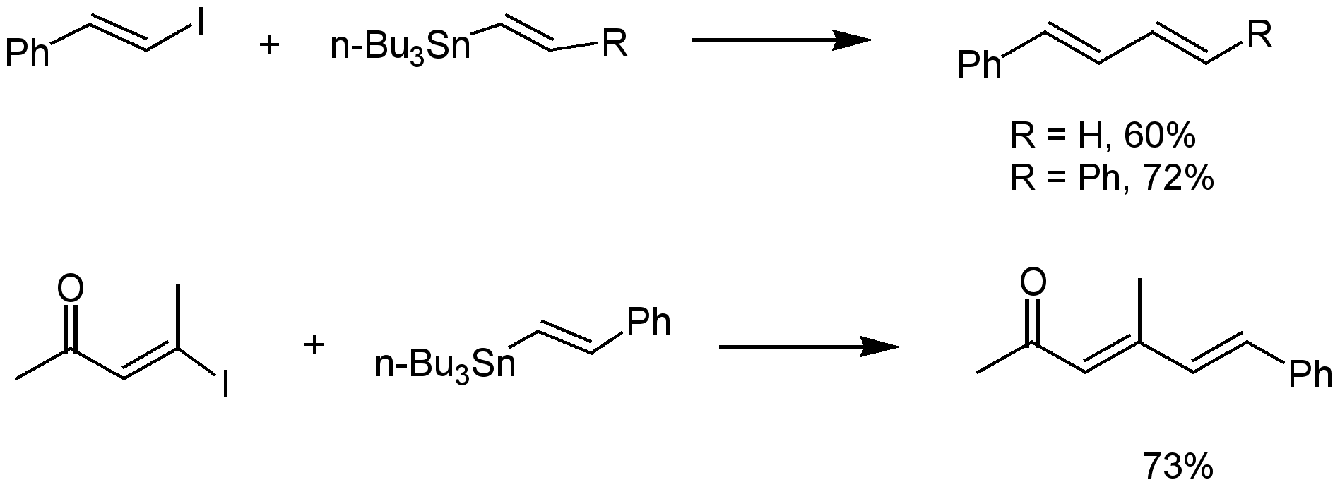 Деактивированные винил- и арилгалогениды имеют достаточно низкую реакционную способность для того, чтобы использовать их в качестве электрофильных реагентов в реакциях с литий- и магнийорганическими соединениями. Если же реакция и идёт, то не как нуклеофильное замещение, а по механизму присоединение – элиминирование, или же через промежуточное образование дегидробензола.Error: Reference source not found Взаимодействие оловоорганических реагентов с арил- и винилгалогенидами проходит в очень мягких условиях в присутствии каталитических количеств комплексных соединений палладия (0). Так, винилгалогениды взаимодействуют с винилорганостаннанами при комнатной температуре с образованием арилсодержащих диенов.