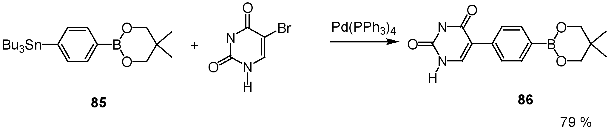 Соединение 85, содержащее наряду с оловоорганическим фрагментом остаток борной кислоты, селективно реагирует по станнильной группе (реакция Стилле), но не по остатку борной кислоты (реакция Сузуки, также катализируемая комплексными соединениями палладия).53