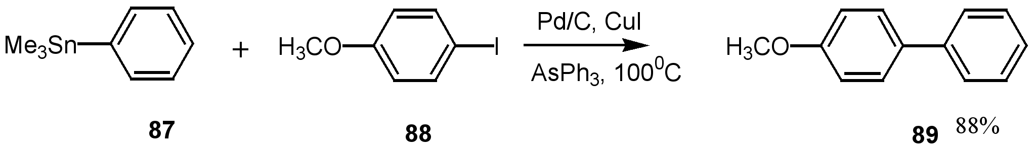 Авторами данной работы предложена удобная модификация реакции с использованием доступного катализатора – палладия на твёрдом носителе углероде (Pd/C). При использовании в качестве электрофильного реагента арилгалогенидов, содержащих метоксигруппу, наблюдалось образование бифенила, являющегося продуктом побочной реакции диметоксилирования. На примере реакции трибутилфенилстаннана 87 с пара-иоданизолом 88 подобраны оптимальные условия проведения реакции. Оказалось, что использование добавок 10% CuI и 20% AsPh3 позволяет практически полностью подавить реакцию образования бифенила, а выход целевого продукта 89 составил 88 % в отличие от 46 % выхода, наблюдаемого при использовании только лишь Pd/C.