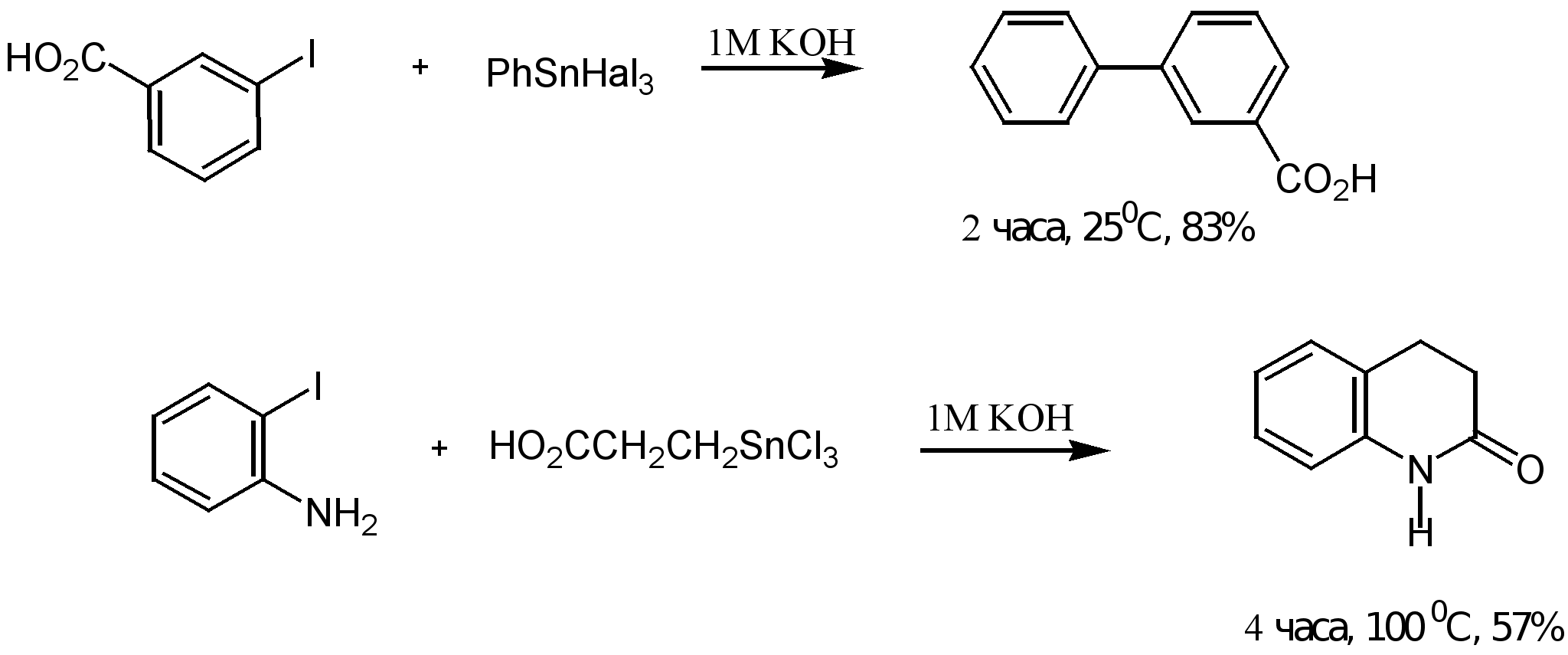 Оловоорганические гидроксиды, полученные взаимодействием едкого калия с бензотрихлоридоловом, были успешно использованы в синтезе биарилов в водной среде.55