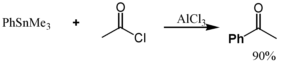 В 1942 году советскими химиками было показано, что алкил- и арилстаннаны реагируют с ацилирующими агентами в присутствии AlCl3.56