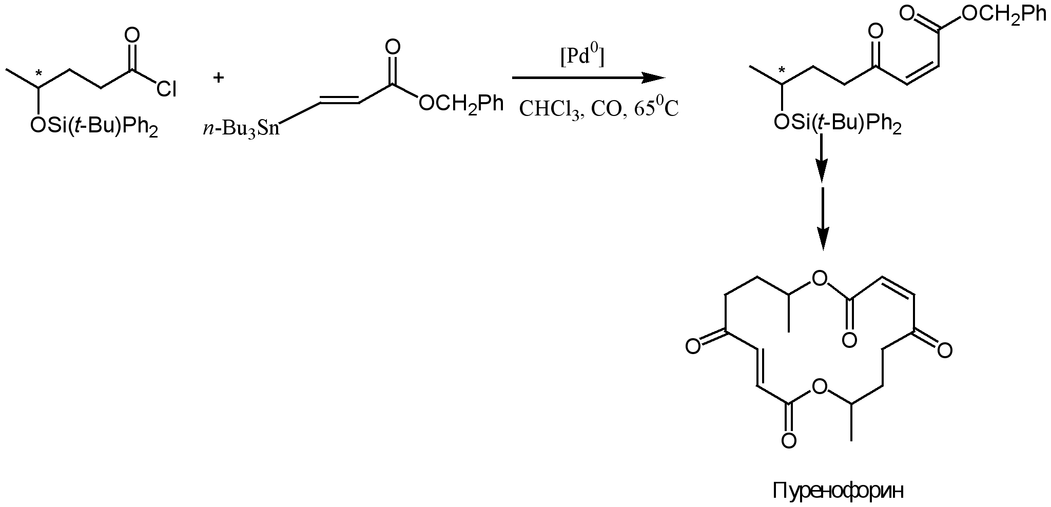 Реакция образования кетонов активно используется в синтезе природных соединений. Так, ключевой интермедиат в синтезе антибиотика пуренофорина был получен по реакции Стилле, причём реакция происходит с сохранением Z-конфигурации реагирующего ,-ненасыщенного сложного эфира.59