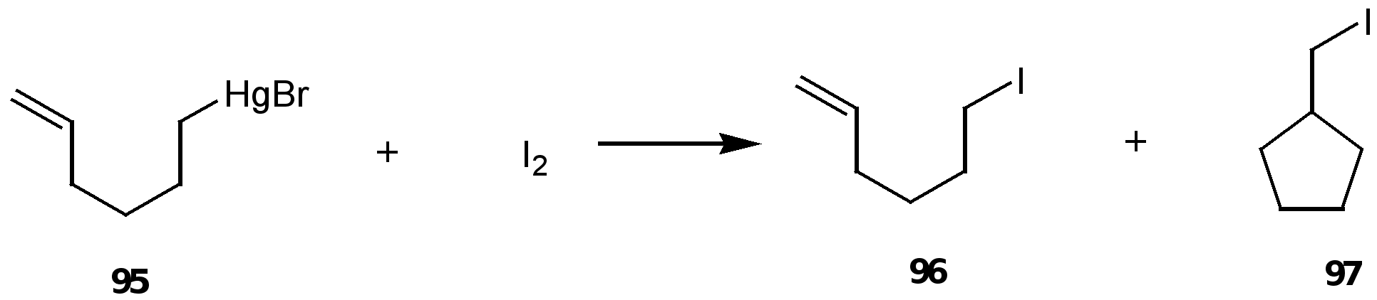 Реакция галогенирования ртутьорганических соединений является удобным методом получения галогенсодержащих органических соединений. Однако, данная реакция крайне чувствительна к условиям проведения процесса. В зависимости от структуры исходного ртутьорганического соединения, полярности растворителя, присутствия влаги или света, механизм реакции может измениться, и процесс будет проходить по радикальному механизму, что во многих случаях приводит к образованию продуктов реакции изомеризации и перегруппировки. Так, при взаимодействии 6-бромомеркурогексена-1 95 с йодом наряду с ожидаемым продуктом электрофильного замещения 96, происходит образование циклического продукта 97. 62