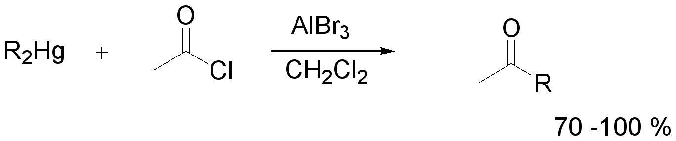 Ртутьорганические соединения вступают в реакцию ацилирования. В качестве ацилирующих агентов используют ацилгалогениды в присутствии каталитических количеств солей палладия или же кислот Люиса. Выходы соответствующих кетонов обычно достаточно велики и составляют от 70 до 100 %.66