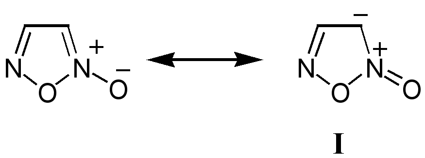 В спектре ЯМР 13С обращает на себя внимание большая разница в химических сдвигах атомов углерода фуроксанового цикла, составляющая 51 м.д.. Как известно анизотропные эффекты практически не влияют на положение сигнала в спектре ЯМР 13С, поэтому, по мнению ряда авторов,Error: Reference source not found дополнительное экранирование достигается за счёт повышения электронной плотности на атоме углерода, примыкающем к N-оксидной группе, благодаря значительному вкладу в резонансный гибрид структур типа I.