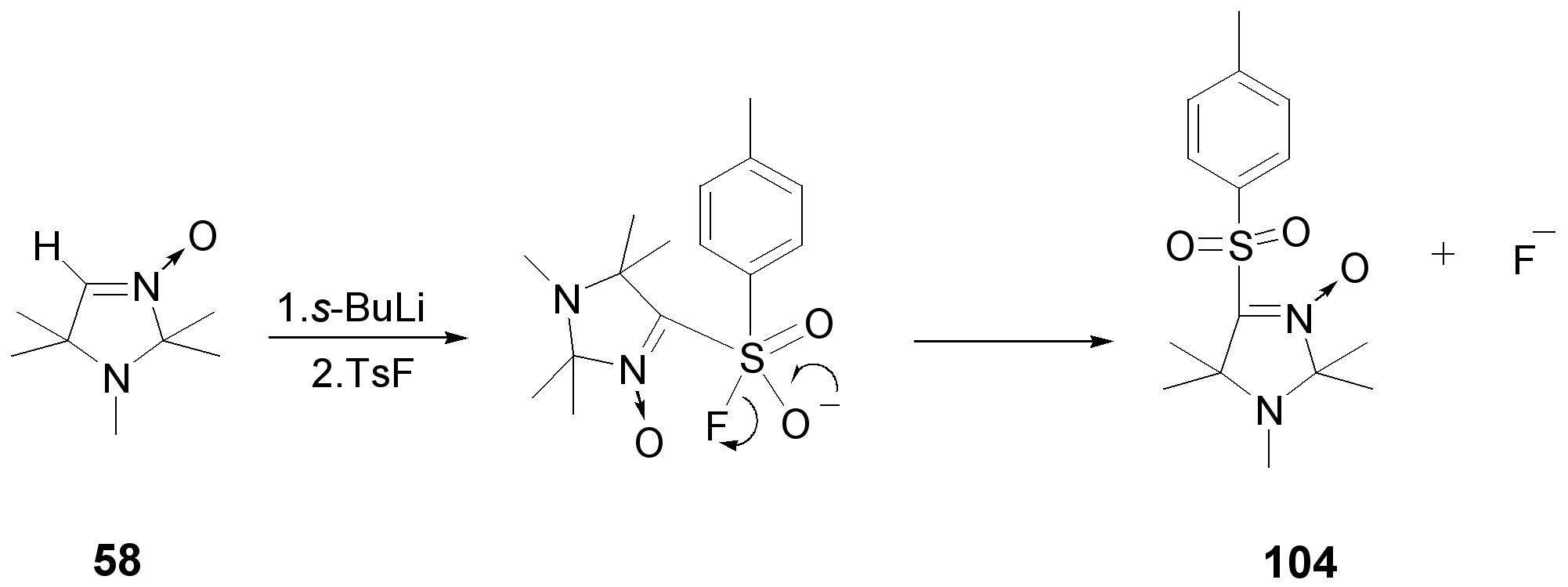 Полученный нами результат находится в соответствии с литературными данными, согласно которым реакции литийорганических соединений с фторангидридами сульфоновых кислот приводит к образованию соответствующих сульфонов, а при взаимодействии с хлорангидридами сульфоновых кислот происходит образование соответствующих хлорзамещённых производных.76 Различная реакционная способность TsF и TsCl связана, видимо, с большей электротрицательностью атома F, что приводит к увеличению чувствительности атома серы к атаке нуклеофильным реагентом. Взаимодействие литиированного производного альдонитрона 58 с Ph2P(O)Cl приводит к образованию 1,2,2,5,5-пентаметил-4-дифенилфосфиноил-3-имидазолин-3-оксида 105 с выходом 60%.