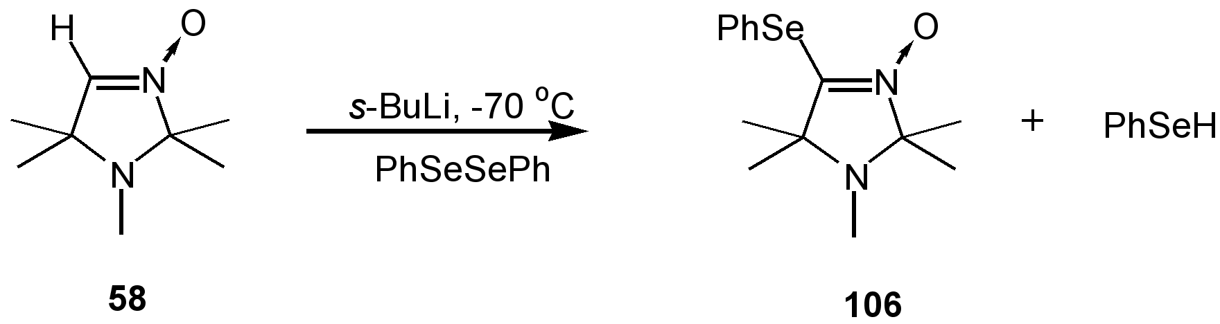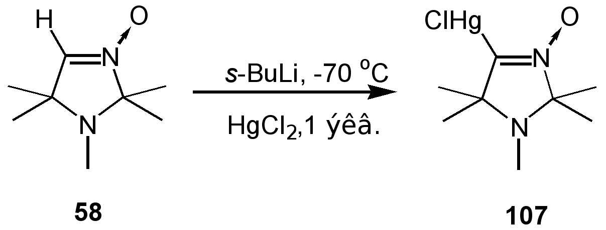 Аналогично, в указанных выше условиях альдонитрон 59 - производное пирролин-1-оксида реагирует с PhSeSePh с образованием 2,2,4,4-тетраметил-5-фенилселенилпирролин-1-оксида 106а. С использованием последовательности литиирование альдонитрона – электрофильное замещение были синтезированы a-замещенные нитроны, содержащие связь a-углерод - металл. Так, взаимодействие металлированного альдонитрона 58 с одним эквивалентом хлорида ртути (2+) приводит к образованию высокоплавкого кристаллического соединения. В ИК-спектре полученного соединения наблюдается полоса при 1576 см-1, отнесенная к валентным колебаниям связи C=N. В масс-спектре полученного соединения наблюдается пик молекулярного иона, соответствующего брутто-формуле C8H15N2OHgCl. В спектре ЯМР 1H имеются сигналы геминальных метильных групп в положениях 2 и 5 имидазолинового цикла и сигнал протонов группы NCH3. В спектре ЯМР 13C наряду с сигналами атомов углерода имидазолинового цикла, наблюдается сигнал при 172.18 м.д., отнесенный к резонансу атома углерода группы C=N. Столь слабопольное положение сигнала не является характерным для атомов углерода нитронной группы, а свойственно, скорее, атому углерода иминогруппы. В области, близкой к этому сигналу (140-160 м.д.), обычно наблюдается резонанс атомов углерода связи C=N в нитронах с заместителями у a-атома углерода, имеющими неподеленную пару электронов (a-N-, O- и S-замещенные нитроны).78 Очевидно, что в данном случае слабопольное положение сигнала связано с другой причиной. Известно, что увеличение ионного характера связи углерод-металл приводит к значительному сдвигу сигнала атома углерода в слабое поле.79 Так, например, сигнал атома углерода фениллития наблюдается при 186-193 м.д,80 а сигнал атома углерода -литиированного производного альдонитрона 58, по литературным данным, наблюдается в спектре ЯМР 13С при 213 м.д..81 Скорее всего, именно эта ситуация и реализуется в случае полученного нами соединения со связью C-Hg, носящей сильнополярный характер. Следовательно, положение сигнала атома углерода нитронной группы в области 170 м.д. можно считать характерной чертой спектров ЯМР 13C a-меркуронитронов. Таким образом, спектральные данные и данные элементного анализа позволили нам приписать полученному соединению структуру 4-хлоромеркуро-1,2,2,5,5-пентаметил-3-имидазолин-3-оксида 107.