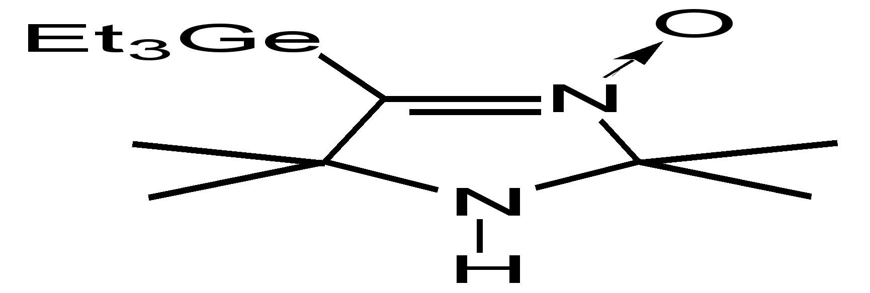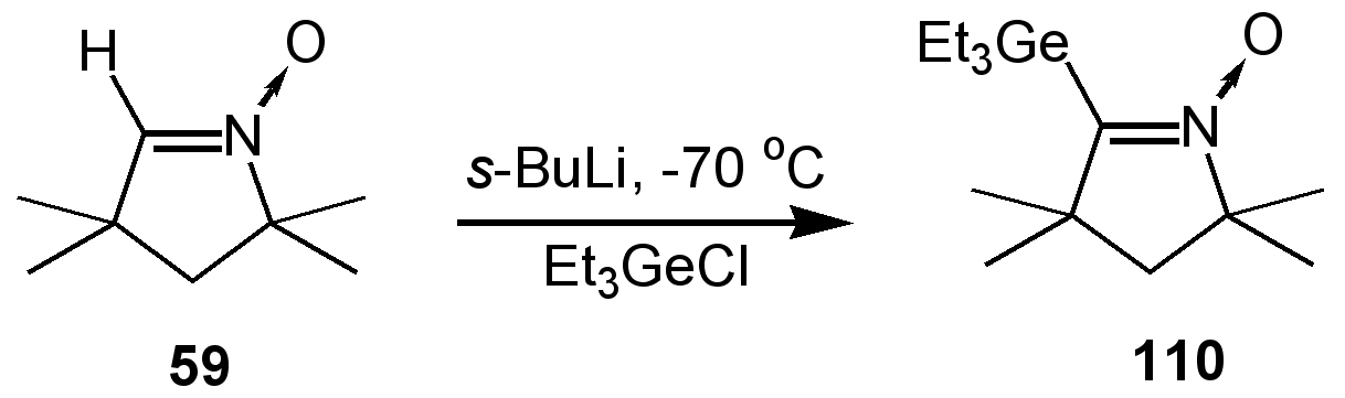 Аналогично, реакция литиированного производного альдонитрона 59 – производного пирролин-1-оксида с 1/2 эквивалента HgCl2 с выходом 25 % приводит к образованию бис-(3,3,5,5-тетраметилпирролин-1-оксид-2-ил)ртути 109. Взаимодействие альдонитрона 59 с Et3GeCl с выходом 80 % приводит к маслообразному продукту, из масс-спектра которого был рассчитан элементный состав, отвечающий брутто-формуле C14H29NOGe. В ИК спектре полученного соединения имеется полоса при 1532 см-1, отнесённая к валентным колебаниям нитронной группы. В спектре ЯМР 1Н наблюдаются сигналы протонов геминальных метильных групп и группы CH2 пирролинового цикла при 1.13, 1.36 и 1.70 м.д. соответственно, а также мультиплет в области 1.0-1.1 м.д., отнесенный к резонансу протонов алкилгермильной группы. на основании спектральных данных, а также данных элементного анализа полученному соединению была приписана структура 3,3,5,5-тетраметил-2-триэтилгермилпирролин-1-оксида 110.