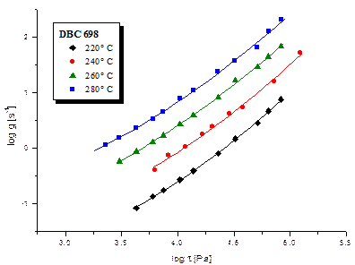Рис. 8. Экспериментальные данные типичного представителя разветвлённых САН (DBC 698) Общий вид кривых для разветвлённых образцов, в принципе, носит аналогичный характер как и у кривых для линейных САН. Можно отметить, что при тех же значениях напряжений, у разветвлённых образцов скорости деформаций имеют более низкие значения, нежели у линейных. Это опять же можно объяснить с точки зрения конформации полимеров, проще говоря, разветвлённые образцы имеют меньшее число степеней свободы движения сегментов их макромолекул, отсюда и вытекает, что нужно приложить большее напряжение, чтобы полимер стал испытывать необратимые деформации (течь). Теперь перейдём непосредственно к кривым течения (lgη=f(lgγ)) и рассчитанным значениям вязкостей (для определённости вычисленным по приведённым выше формулам для lgγ=1.0 [с-1 ]). Итак, на рис.9 приведена сравнительная диаграмма вязкостей линейных образцов САН при 240°С, а на рис.10 зависимость lgη от lgγ также при 240°С.