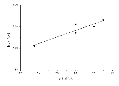 Рис.12 Зависимость энергии активации от содержания акрилонитрильных групп в образцах САН. Расчёты показали, что энергия активации течения, вычисленная при использовании уравнения Аррениуса, находится в пределах 110-115 кДж/моль в случае ньютоновского течения. Значения Еа взяты из вязкостно-температурных зависимостей, при условии постоянства напряжения сдвига. В случае деформации при любой скорости сдвига, её (γ) увеличение приводит к уменьшению энергии активации. Величина Еа увеличивается с увеличением концентрации акрилонитрила в образцах линейных САН (см. рис. 12). Различные значения энергии активации для образцов с содержанием акрилонитрильных групп 28% (SANM80 и SANM60) очевидно обусловлено различиями их молекулярных масс и молекулярно-массовых распределений (см. табл.1). На основании исходных данных о молекулярной массе и ММР этих двух образцов более высокие значения вязкости SANM100 обусловлены также и его более высокой молекулярной массой (почти на 20% выше чем у SANM80) и более узким ММР. Так как для течения всей макромолекулы необходимо совместное перемещение многих сегментов, то становится понятно, что сопротивление, оказываемое макромолекулой в потоке, зависит от её молекулярной массы, что и наблюдается в случае этих двух образцов (рис. 10) - вязкость наиболее "тяжёлого" выше. Также на это оказывает влияние и количество зацеплений в макромолекулах. Теперь перейдём к рассмотрению образцов разветвлённых САН. Данные, полученные при эксперименте, представлены на рис.8 в логарифмических координатах - зависимость скорости сдвига от напряжения сдвига. Также представлены кривые течения для них при 240°С на рис.13. И сравнительная диаграмма их вязкостей при скорости сдвига γ=1,0 (рис.14).
