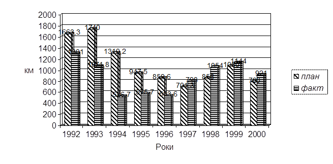 З таблиці видно, що за період 1993-2000 рр. інфраструктура по обслуговуванню колійного господарства дещо скоротилася. Ліквідовано: одну дистанцію колії, три дистанції лісозахисних насаджень, п'ять колійних машинних станцій, три рейкозварювальних поїзди. До 1991 р. залізниці України отримували в середньому за рік 2 млн. дерев'яних шпал та 700 комплектів брусів, а у 1992 р. поставки були зменшені у сім разів, а потім зовсім припинені. Укрзалізниця, щоб вийти з положення та покрити гостру потребу в шпалах побудувала ще один завод по виробництву залізобетонних шпал і брусів для стрілочних переводів. Технічна політика колійного господарства за останні роки та на перспективу базується на укладанні в колію залізобетонних шпал і перевідних бруссів. Залізниці оснащені залізобетонними шпалами нерівномірно. Так, на Південно-Західній і Південній залізницях оснащення головних колій залізобетонними шпалами досягає 76-78%, тоді як на Львівській - тільки 25%. На інших залізницях оснащення залізобетонними шпалами складає 51-62%. Кількість стрілочних переводів на залізобетонних шпалах за останні два роки майже подвоїлася (з 5,3% до 9%). Реструктуризація в колійному господарстві спрямована на приведення його у відповідність з обсягами роботи і зміни організаційної структури підприємств. В даний час і в перспективі немає необхідності нарощувати довжину залізниць, її необхідно значно скоротити. Наявне колійне господарство залізниць України також перебуває не в кращому технічному стані. З усіх блоків матеріально-технічної бази воно є одним із самих неблагополучних. Наявність зайвої, але технічно ненадійної мережі залізниць, тільки створює видимість масштабності їхньої пропускної і провізної спроможності. Насправді ж експлуатація застарілої верхньої будови колії не тільки відволікає величезні ресурси (трудові, матеріальні, енергетичні, фінансові) на їхній ремонт і утримання, але і негативно впливає на рівень продуктивності та ефективності використання нової техніки, усієї роботи залізничного транспорту. Технічний стан колії у визначальній ступені залежить від своєчасності планових видів ремонту. У табл. 1.3 та на рис. 1.1 представлені дані, що характеризують планові завдання і фактичне виконання капітального ремонту колій на залізницях Укрзалізниці. Таблиця 1.3. Динаміка капітального ремонту колій
