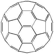Рисунок 1. Шаростержневая модель молекулы фуллерена-60. Рисунок 2. Проекционная формула фуллерена-60. Физические свойства Внешне фуллерены представляют собой мелкокристаллические порошки черного цвета, лишенные запаха. В воде, этаноле, ацетоне и других полярных растворителях они практически нерастворимы, зато в бензоле, толуоле, фенилхлориде растворяются с образованием окрашенных в красно-фиолетовый цвет растворов. Замечательно, что если к насыщенному раствору C60 в диоксане, имеющему желто-коричневый цвет, добавить каплю стирола, мгновенно происходит явственное изменение окраски раствора на красно-фиолетовую, объясняемую образованием комплекса (сольвата). Энтальпия образования фуллерена-60 составляет приблизительно 42.5 кДж/моль, а C70 - 40.3 кДж/моль. Это говорит о том, что они менее стабильны, чем графит (0 кДж/моль) и алмаз (1.67 кДж/моль), причем с увеличением размеров сферы (то есть по мере увеличения числа атомов углерода) энтальпия образования асимптотически стремится к энтальпии графита, так как сфера все более напоминает плоскость. Твердый C60 имеет гранецентрированную кубическую решетку при комнатной температуре, его плотность составляет 1.68 г/см3 . Ввиду слабого межмолекулярного взаимодействия молекулы свободно вращаются. Ниже 0° С происходит превращение в кубическую решетку. Фуллерен-70, свободное вращение которого слегка затруднено по причине асимметричности молекулы, испытывает фазовый переход при более низкой температуре. Из насыщенных растворов в ароматических растворителях фуллерены при низких температурах выпадают в виде кристаллосольватов вида C60 ·Xn , где в качестве X выступают бензол, толуол, стирол, ферроцен и другие молекулы. Следует добавить, что так как энтальпия растворения фуллерена в большинстве растворителей положительна, при повышении температуры растворимость, как правило, ухудшается. Реакционная способность фуллеренов