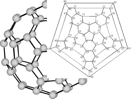 Для химика, основные области интересов которого - изучение превращений известных веществ и синтез новых, элементарный углерод - не самое интересное из веществ. Ситуация замечательным образом изменилась в 1985 г., когда семейство аллотропов углерода, насчитывавших в то время графит и алмаз, обогатилось фуллеренами. Новая форма углерода растворима в целом ряде органических растворителей, что исключительно важно для осуществления химических превращений. Фуллерены построены из пятиугольников и шестиугольников, в вершинах которых лежат атомы углерода. Наименьшим стабильным фуллереном является бакминстерфуллерен C60 (Рисунок 1). Его следующим устойчивым гомологом является C70 , за которым следуют C76 , C78 , C82 , C84 , C90 , C94 , C96 и т.д. В основе строения их молекул лежит одно из следствий теоремы Эйлера, которое говорит о том, что для выстилания сферической поверхности необходимо n шестиугольников и 12 пятиугольников, за исключением n = 1. По сравнению с двумерными молекулами, такими, как плоский бензол, фуллерены кажутся шедеврами трехмерной архитектуры, взывающими к эстетическому вкусу ученых, в результате чего, вероятно, эта область химии так бурно развивается в последнее десятилетие. Для химиков-синтетиков открылась возможность получения бесчисленных производных, комбинируя фуллерен с представителями множества известных классов веществ. Одним из первых были поставлены вопросы: каким типом реакционной способности обладает фуллерен? Можно ли его представлять себе как трехмерный аналог бензола? Как устроены его производные и какими свойствами они обладают? В соответствии с правилами IUPAC фуллерен C60 получил название, которое слишком неудобно для повседневного употребления: гентриаконтацикло-[29.29.0.02,14 . 03,12 .04,59 .05,10 . 06,58 .07,55 .08,53 . 09,21 .011,20 .013,18 . 015,30 .016,28 .017,25 . 019,24 .022,52 .023,50 . 026,49 .027,47 .029,45 . 032,44 .033,60 .034,57 . 035,43 .036,56 .037,41 . 038,54 .039,51 .040,48 . 042,46 ]-гексаконта- 1,3,5(10),6,8,11, 13(18),14,16,19, 21,23,25,27,29(45), 30,32(44),33,35(43), 36,38(54),39(51), 40(48),41,46,49, 52,55,57,59- триаконтаен. Однако возможность существования огромного числа изомеров требует введения более простой номенклатуры. Так, C60 предложено называть [5,6]-фуллереном-60-Ih , где цифры 5 и 6 указывают на структурные единицы молекулы - пятиугольники и шестиугольники, а цифра 60 обозначает общее число атомов углерода в молекуле. Так как у простейших фуллеренов существует только по одному стабильному изомеру, их названия упрощают до фуллерена-60 и фуллерена-70. При записи структурных формул атомы углерода с обратной стороны сферы опускают для ясности (Рисунок 2). Шлегель предложил нумеровать атомы углерода по часовой стрелке, начиная с шестиугольника (Рисунок 3).