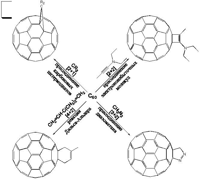 Наиболее типичными являются реакции Дильса-Альдера ([4+2]циклоприсоединение), в которых фуллерен выступает в качестве диенофила. В случае активных диенов характер устанавливающегося равновесия таков, что выход аддуктов весьма высок, а их очистка возможна методами жидкостной хроматографии с использованием толуола в качестве элюента: