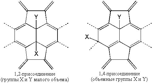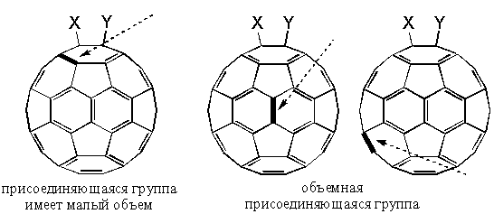 Многие из таких аддуктов обладают замечательной устойчивостью, хотя при этом неизбежно нарушается идеальная сфера молекулы C60 , так как атомы углерода, к которым оказываются присоединенными заместители, обладают тетраэдрическими орбиталями (sp3 -гибридизация), что деформирует молекулу. Поэтому, несмотря на то, что многие реакции присоединения являются экзотермическими, выделение тепла по мере введения новых групп уменьшается. Вместе с тем появляется вопрос о региоселективности присоединения. Как правило, первая молекула присоединяется в положение 1,2-, то есть в линии, где соприкасаются два шестиугольника (Рисунок 3) или в 1,4-, если группы являются