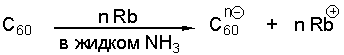 Очень легко происходят реакции химического восстановления фуллеренов активными электроположительными металлами, например, раствором рубидия в жидком аммиаке. Исходный фуллерен берут в виде суспензии, а получающийся анион оказывается растворимым в аммиаке: Обработка полученных полианионов алкилйодидами приводит к полиалкилированным фуллеренам; таким образом был получен C60 (CH3 )24 . Открытие сверхпроводимости комплексов C60 со щелочными металлами привлекло внимание научного сообщества к этому классу соединений. Первой полученной солью этого типа был K3 C60 , переход которого в сверхпроводящее состояние совершается при 19.3 К. За короткое время было синтезировано и изучено значительно количество таких соединений, изменяющихся на воздухе, но устойчивых к нагреванию. Так, K6 C60 разлагается в запаянной трубке при 550 ° С по схеме: Образование фуллеридов металлов объясняется внедрением ионов в гранецентрированную кубическую решетку, где они занимают свободные тетраэдрические о октаэдрические полости. Например, в соединении Na2 C60 ионы натрия занимают две тетраэдрические полости, не изменяя параметров кристаллической решетки фуллерена-60. Более объемные ионы, чем Na+ , заметно деформируют решетку, обусловливая низкотемпературную сверхпроводимость при условии, что фуллерен существует в виде аниона C60 3- .