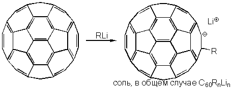 Фуллерен-60 легко взаимодействует с литийорганическими соединениями и реактивами Гриньяра, образуя в качестве первичных интермедиатов анионы RC60 - . Процесс проходит очень быстро; например, в толуоле осадок солей выпадает практически мгновенно: Дальнейшая обработка, например, раствором хлороводорода в метаноле позволяет получить производные гидрофуллеренов, а йодистым метилом - метилфуллеренов: