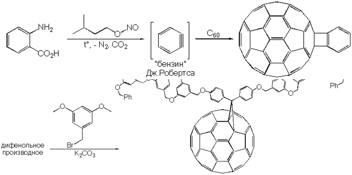 Растворимость другого аддукта, полученного с использованием эфира бензо[18]краун-6, в полярных протонных растворителях, сильно зависит от концентрации ионов K+ ; это приводит к выводу, что эфирная группировка практически не взаимодействует с фуллереновой частью молекулы: