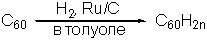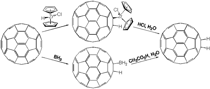 Вместе с тем гидриды с небольшим числом водородных атомов, такие как C60 H2 , C60 H4 , C70 H2 , получены и охарактеризованы. Прямое восстановление фуллерена водородом на активированном угле с рутением в качестве катализатора возможно только в жестких условиях (высокое давление и температура) по схеме: Наибольшая достигнутая степень гидрирования соответствует C60 H50 и C70 H36 , являющихся энергичными восстановителями. Для получения ди- и тетрагидридов наиболее подходящими оказались методы гидроборирования (взаимодействие с бораном) и гидроцирконирования (восстановление дициклопентадиенилцирконийгидрохлоридом, имеющим сэндвич-структуру):