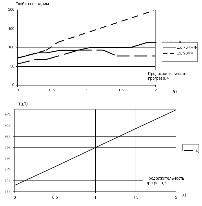 П Рисунок 1.2 – Распределение температуры в поверхностном слое валков диаметром 1200, 1600 и 2000 мм из стали типа 75ХМФ в конце градиентного нагрева. Следует подчеркнуть, что реальное проектирование режима нагрева возможно только после определения реально возможной максимальной интенсивности нагрева в ходе теплотехнических испытаний ПСН, а также реальной трещиностойкости металла в сердцевине валков из разных марок стали, подвергнутых улучшению. Продолжительность выдержки при поддержании температуры бочки валка на уровне температуры нагрева ТН зависит от желаемой глубины прогрева поверхностного слоя до температуры аустенизации АС3. В свою очередь, оптимальная величина прогрева зависит от прокаливаемости стали и интенсивности охлаждения. Суть процесса заключается в следующем. При увеличении глубины аустенизированного слоя растет и глубина закаленного слоя, но только до определенной величины, ограниченной возможностями стали (прокаливаемостью) и спрейерной установки (максимальной интенсивностью охлаждения). Рост глубины прогрева свыше этого оптимального значения приводит к накоплению излишнего тепла в валке, что начинает снижать скорость охлаждения на границе закаленного слоя, повышает температуру на оси валка и приводит к росту остаточных напряжений. Вкратце этот принцип следует охарактеризовать так: не следует прогревать валок больше необходимого. В качестве иллюстрации на рисунке 1.3 для валка диаметром 1200 мм показаны зависимости глубины аустенизированного слоя LА и закаленного слоя LЗ (закаленным слоем условно принят слой с твердостью выше 45HS, что соответствует наличию в структуре не менее 50% бейнитно-мартенситной смеси) от продолжительности нагрева при температуре поверхности ТН=950С (сталь 75ХМФ) и ТН=920С (сталь 90ХФ). Нагрев до температуры ТН проводился со скоростью 300С/ч по металлу, охлаждение – с максимально возможной для данной спрейерной установки, которая допускает проводить охлаждение с максимальной плотностью орошения от 1.14 кг/м2с (валок диаметром 2000 мм) до 1.9 кг/м2с (валок диаметром 1200 мм).