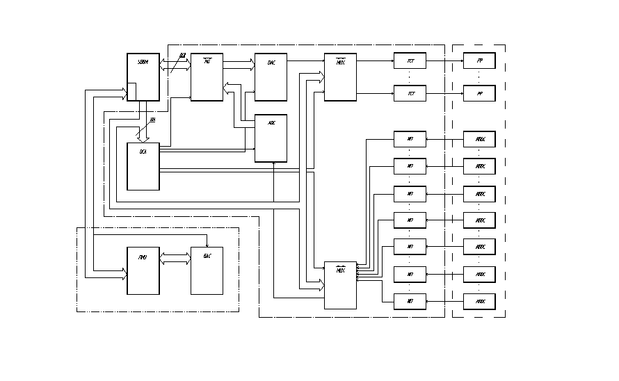 3.2.10 Проектирование модулей АЦП и ЦАП Модуль аналого-цифрового преобразования построен на интегральной схеме АЦП типа К1113ПВ1 – десятиразрядный АЦП, сопрягаемый с микропроцессором. Эта микросхема не требует дополнительных устройств выборки и хранения и промежуточных буферных регистров. Для нормальной работы преобразователя необходимо ввести промежуточный нормирующий усилитель на интегральной микросхеме ОУ типа 140УД8. Сигналы для преобразования поступают от 24 измерительных преобразователей непрерывного действия. Для упрощения схемы модуля АЦП (установки только одной микросхемы К1113ПВ1 и уменьшения числа оптопар для гальванической развязки силовой и информационной цепей) необходимо включение аналоговых мультиплексоров общей структурой 24-1. Применим микросхемы типа К590КН6 – аналоговые коммутаторы 8-1, для полного переключения всех сигналов необходимы три такие микросхемы. Для выбора одного из 24 каналов необходимы 5 разрядов адреса: 3 для выбора канала в микросхеме и 2 для выбора необходимой микросхемы. Микросхема К1113ПВ1 содержит устройство выборки и хранения, собственно АЦП и промежуточные буферные регистры, – т. е. в случае ее применения не требуется включения каких либо дополнительных устройств. Модуль цифро-аналогового преобразования построен на интегральной микросхеме ЦАП типа К572ПА1 – восьмиразрядный цифро-аналоговый преобразователь. Для получения сигналов напряжения разной полярности был разработан управляемый источник опорного напряжения. Для получения сигналов тока, необходимых для управления пропорциональными распределителями, разработаны генераторы стабильного тока управления. Максимальный выходной ток генератора составляет 1А. Дискретность преобразования микросхемы К572ПА1 составляет 256. Максимальный ход золотника управления в пропорциональных распределителях равен 1мм, при этом скорость вращения валка является максимальной – 20 с-1, следовательно, минимальная скорость вращения, которую позволит такая система управления, будет составлять 0,078 с-1. Для системы регулирования подачи воздуха и газа на горелки: максимальный ход золотника управления равен 100мм, при этом расход газа через распределитель равен 10м3/ч, следовательно, минимальный расход составляет 0,039м3/ч, что позволяет управлять процессом градиентного нагрева в очень широких пределах, за счет раздельного согласованного регулирования частоты вращения валка и подачи газовоздушной смеси в рабочее пространство печи. 3.2.11 Сопряжение с датчиками перемещения Датчики перемещения типа HSM-150/2 представляют собой фотоэлектрические преобразователи величины линейного перемещения в две последовательности импульсов ТТЛ-уровня, сдвинутых относительно друг друга на 90, что позволяет определять не только величину перемещения, но и направление движения. По техническим характеристикам датчика: дискретность составляет 15 импульсов на миллиметр, или: