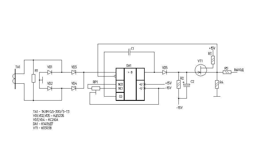 3.2.3 Сопряжение с датчиками тока типа ТКЛМ-0.5-300/5 Трансформатор тока типа ТКЛМ-0.5Т3 на вторичной обмотке выдает ток 5 А частотой 50 Гц. Для подключения АЦП необходимо получить постоянное напряжение, пропорциональное току. Для этого применим двухполупериодное выпрямление измерительного сигнала и амплитудное детектирование (рисунок 3.4). Р Определим параметры элементов схемы. Величина сопротивления резистора R1. На вход операционного усилителя должно подаваться напряжение не более 10 В. Тогда напряжение (синусоидальное) на резисторе R1: UR1=20 В, откуда: R1=UR1/IT1=20/5=4 Ом, мощность резистора R1: PR1=I2R1=524=100 Вт. Принимаем резистор R1 типа ПЭЛ-100-3.9. Тогда: UR1=IR1=19.5 В. Для определения параметров диодов моста необходимы параметры операционного усилителя (ОУ). Принимаем ОУ типа 140УД7, входной ток которого IВХ.ОУ=0.55 А. По этому значению тока и напряжения UR1 принимаем диоды моста VD1, VD2 типа КД521Б. Стабилитроны VD3, VD4 предназначены для защиты ОУ от перегрузок по входному напряжению. По максимальному входному напряжению ОУ (UВХ.ОУ=10 В) выбираем стабилитроны типа КС210А. Диод VD5 – КД521А (UVD5=10 В, IMAX=0.55A). Транзистор VT1: напряжение затвор-сток UЗС=UВЫХ.ОУ+UПИТ=10 + 15=25 В; напряжение затвор-исток UЗИ0; напряжение сток-исток UСИ=UВЫХ+UПИТ=10 + 15=25 В; ток стока (по входному току АЦП) IС 10 мА. По этим данным принимаем VT1 типа КП303В. Резистор R2 – ограничитель тока стока VT1. Для нормальной работы детектора IСIВЫХ.ОУ=10…15 мА, тогда: R2= UПИТ/IС= 15/(1510-3)=1 кОм. Постоянная времени интегрирования: