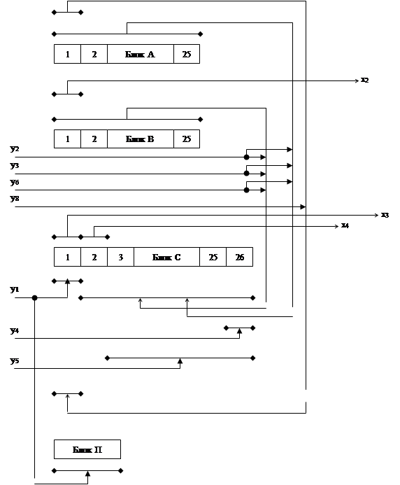 1.2 Разработка структурной схемы операционного автомата. Структурная схема дает представление о количестве блоков, входящих в структуру, их назначении, описание особенностей и о связях между блоками в процессе реализации функций устройства. Количество блоков равно количеству слов с памятью, то есть необходимо четыре блока. Связь между блоками (регистрами) осуществляется при передаче информации из блока в блок или при занесении информации извне. Входными сигналами в операционный автомат являются сигналы из управляющего автомата, они дают команду на выполнение микроопераций над словами. Выходными сигналами из операционного автомата являются значения логических условий, которые в свою очередь поступают на входы управляющего автомата. Тогда с помощью данных из таблиц 1, 2, 3, 4 можно составить структурную схему операционного автомата, которая представлена на рис. 1.2.1.