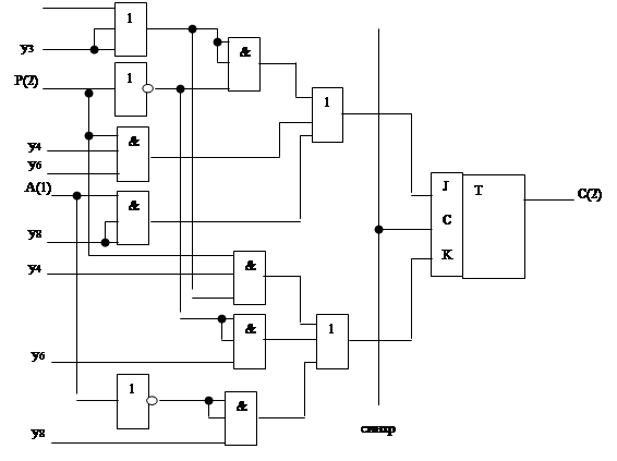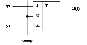 Рис. 2.1.1. 2.2. Синтез блока С В блоке С выделено несколько полей, соответственно синтез будет производиться для каждого из них отдельно. Поле С(1). y1 : С(1):=0 Таблица и функции аналогичны таблице 5 и функциям для микрооперации y1 над полем П(1). J=0, K=1. y2 : С(1):=P(1), где P(1) – перенос в первый разряд из второго. Так как р поле С(1) было обнулено при микрооперации y1 , то в таблице 7 можно рассматривать только наборы, где С(1)=0. Таблица 7