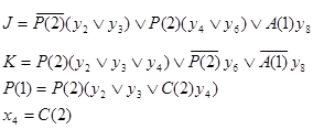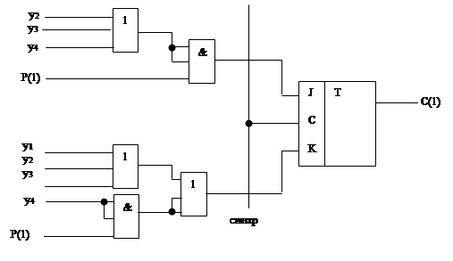 Дополнив функцию на невозможных наборах, получаются следующие выражения функций возбуждения. J=P(1), K=1. Функция P(1) будет найдена при синтезе поля С(2), так как она зависит от значения самого поля, переноса в этот разряд и значения слагаемых, сумма которых записывается в разряд С(2). y3 : В этой микрооперации все аналогично таблице 7, то есть J=P(1), K=1. y6 : С(1):=0 Таблица переходов аналогична таблице 5, значит сразу известны выражения для J и K. J=0, K=1. y4 : C(1):=C(1)+P(1)