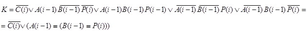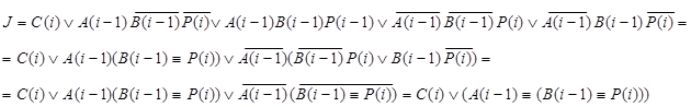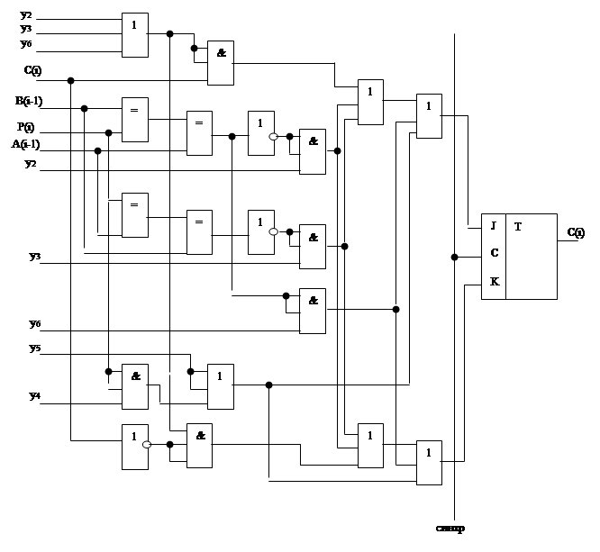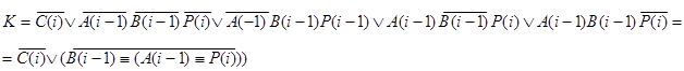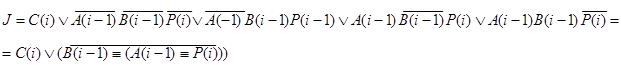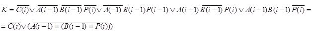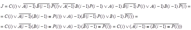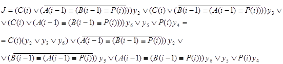 Из таблицы 11 можно написать выражения для J и K. J=1 K=1 y6 : C(i):=A(i-1)+B(i-1)+P(i), переход к булевой функции,