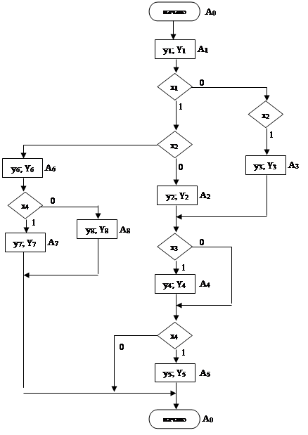 Схема КС2 может быть реализована в виде стандартного блока – дешифратора, выполняющего функции дешифрации состояний автомата: некоторому состоянию Аf ставится в соответствие сигнал Yr =1 на выходе дешифратора. 3.2 Закодированная граф – схема и граф управляющего автомата Исходной информацией для определения числа входов, выходов и различных состояний, в которых может находиться управляющий автомат, является содержательный граф алгоритма, представленный закодированной граф – схемой алгоритма (ГСА).Каждой операторной вершине содержательного графа можно поставить в соответствие состояние автомата и выходной сигнал Yn ; условной вершине ставится в соответствие вход xl управляющего автомата. ГСА, эквивалентная содержательному графу изображена на рис. 3.2.1.
