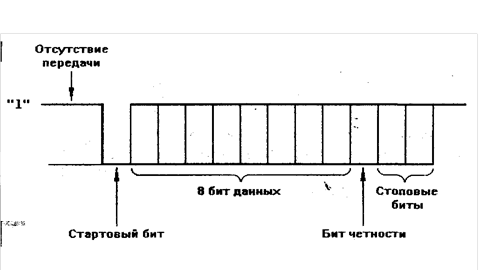 Таблица 1 Назначение контактов разъемов интерфейса RS-232C (I - входной сигнал компьютера, О - выходной сигнал). Назначение сигналов следующее. FG - защитное заземление (экран). -TxD - данные, передаваемые компьютером в последовательном коде (логика отрицательная). -RxD - данные, принимаемые компьютером в последовательном коде (логика отрицательная). RTS - сигнал запроса передачи. Активен во все время передачи. CTS - сигнал сброса (очистки) для передачи. Активен во все время передачи. Говорит о готовности приемника. DSR - готовность данных. Используется для задания режима модема. SG - сигнальное заземление, нулевой провод. DCD - обнаружение несущей данных (детектирование принимаемого сигнала). DTR - готовность выходных данных. RI - индикатор вызова. Говорит о приеме модемом сигнала вызова по телефонной сети. Наиболее часто используются трех- или четырехпроводная связь (для двунаправленной передачи). Схема соединения для четырехпроводной линии связи показана на рис. 4 Для двухпроводной линии связи в случае только передачи из компьютера во внешнее устройство используются сигналы SG и TxD. Все 10 сигналов интерфейса задействуются только при соединении компьютера с модемом. Формат передаваемых данных показан на рис. 5. Собственно данные (5, 6, 7 или 8 бит) сопровождаются стартовым битом, битом четности и одним или двумя стоповыми битами. Получив стартовый бит, приемник выбирает из линии биты данных через определенные интервалы времени. Очень важно, чтобы тактовые частоты приемника и передатчика были одинаковыми (допустимое расхождение - не более 10%). Скорость передачи по RS-232C может выбираться из ряда: 110, 150, 300, 600, 1200, 2400, 4800, 9600, 19200, 38400, 57600, 115200 бит/с.