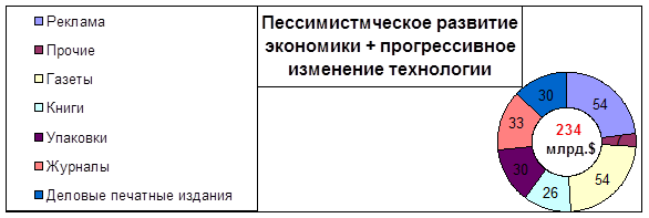 Теперь рассмотрим консервативный и прогрессивный технологические сценарии. Важнейшие области деятельности на рынке печатной продукции охватывают рекламу (каталоги, брошюры, листовки, рекламные письма и др.), развлечения (газеты, журналы, книги, игры), деловую информацию (формуляры, конверты, прейскуранты, канцтовары, перечни, инструкции по эксплуатации), упаковку, прочее (проездные билеты, деньги, чеки, календари, почтовые марки и др.). Из них только упаковка не попадает под давление электронных средств информации. Пока еще в значительной степени доминируют печатные средства информации, однако уже сегодня ожидается бурное развитие всех электронных средств информации. В последние годы начались бес примерные технологические изменения, которые преобразуют целые отрасли промышленности и области жизни. Коммуникационный сектор подвержен особенно большим технологическим изменениям. Двадцатый век обещает стать веком информации, следствием чего, но долгое время коммуникационные технологии останутся инновационным двигателем. К важнейшим изменениям в микроэлектронике и в области переработки данных относятся увеличение мощности компьютерных чипов, использование искусственного интеллекта, увеличение скорости передачи данных по стекловолоконным проводникам и снижение затрат на этот процесс. Введение текста с рукописи или голосом, а иллюстраций – с помощью цифровой фотокамеры с высоким разрешением, оптическая запись на CD- и МО-диски, обмен данными благодаря стандартизированным компьютерным системам и программному обеспечению и др. Результат проведенного анализа позволил сделать следующие выводы: - на основе изменений в микроэлектронике к 2010 г. существенно возрастет мощность электронных средств информации; - электронные средства информации будут внедряться во многие области печатных средств информации и преобразовывать их; - доля печатных средств в общем объеме уменьшится с 70% до 37-57%. Такой прогноз вынуждает поставщиков оборудования для печатных средств информации задуматься о разработке новых стратегий, даже если абсолютный объем рынка не дает оснований для беспокойства. Приведем четыре сценария развития печатных средств информации до 2010 г.