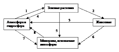 Рис. 2.5. Кругооборот углерода Кругооборот углерода, как и любого другого элемента, совершается как по большому, так и по малому циклам. Большой (геологический) кругооборот углерода можно представить в виде схемы (рис. 2. 6.). В атмосфере и водных источниках присутствует углекислый газ СО2 . Под его действием, а также при участии ветра и воды (Н2 О) частью изменяется состав горных пород (например, карбонатных: известняка СаСО3 , магнезита МgCO3 , доломита СаСО3 ×МgCO3 ): СаСО3 + СО2 + Н2 О ® Са(НСО3 )2 МgCO3 + СО2 + Н2 О ® Мg(НСО3 )2 . Образующиеся растворимые соли (гидрокарбонаты) вымываются и выносятся в океан, частью насыщает воду океана. Частью же под воздействием неорганических условий и фильтрации воды через живые организмы (например, моллюски) эта соль преобразуется и отлагается на дне океана в виде осадочных пород (того же, например, СаСО3 , частью представленного в виде ракушечника, как остатки раковин умерших моллюсков) (пункты 6, 7 рис. 2.5.). Осадочные породы претерпевают метаморфоз (различные превращения), а также под действием тектонических сил перемещаются в глубину земной коры, откуда частью через длительный период поднимаются на поверхность, а быстрее идут процессы под действием вулканических извержений, которые являются вновь источниками углерода в атмосфере в виде СО2 , а иногда и СО, окисляющегося до СО2 . Биотический кругооборот углерода – составная часть большого кругооборота, он связан с жизнедеятельностью организмов.