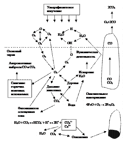 Один из наиболее сложных кругооборотов, так как с кислородом О2 вступает в реакцию большое количество органических и неорганических веществ, а также водород (последний дает с О2 ® воду Н2 О). Упрощенная схема кругооборота кислорода представлена на рис. 2.8). Кругооборот кислорода непосредственно связан с кругооборотом углерода (процессы фотосинтеза, дыхания и питания животных). Особенностью кругооборота кислорода является широкое многообразие кислородсодержащих веществ в биосфере. Кислород в