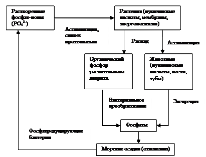 Рис. 2.12. Схема биотического кругооборота азота по Р.Риклефсу (1979 г.) В геологический кругооборот постоянно поступает часть азота в виде различных соединений, частью используемых в сельском хозяйстве в качестве азотных удобрений. Азотсодержащие вещества частью поступают и в реки, благодаря стоку которых выносятся в моря. Часть азота попадает в реки и далее в моря за счет осадков, например, кислотных дождей (содержащих НNО3 ), из-за выбросов оксидов азота (а также образования оксида азота в атмосфере при грозах). Наибольшее содержание соединений азота в районах впадения рек в моря, наименьшее – в центральных частях океанов. Азотсодержащие соединения используются водорослями для синтеза органических веществ и поступают в кругооборот океана, часть постепенно оседает на дно, потому, вынесение азота с суши не увеличивает его концентрацию в морской воде. Неуправляемая же деятельность людей может привести к сильному загрязнению окружающей среды, что нарушит природный баланс. Тревожные изменения в биосфере уже и сейчас столь заметны. Это цветение рек, чрезмерное размножение сине-зеленых водорослей, ускоряющееся заболачивание природных водоемов, ухудшение качества воды и т.д. 2.6.5. Кругооборот фосфора Кругооборот фосфора достаточно сложен. Рассмотрим его в упрощенном виде. Фосфор один из наиболее важных биогенных элементов, так как входит в состав нуклеиновых кислот, костной ткани, клеточных мембран, систем переноса энергии (АТФ) и др. Кругооборот фосфора также совершается по большому и малому циклам, но всецело связан с жизнедеятельностью организмов. Фосфор – подвижный элемент, поэтому его кругооборот зависит от множества факторов окружающей среды, а в наше время особенно - от антропогенных. Так, фосфор активно поступает в водные источники в виде моющих средств (детергентов), фосфорных и комбинированных удобрений с полей, отходов промышленности (особенно продуктов переработки фосфорсодержащих минералов – апатитов и фосфоритов) и др. Это приводит к нарушению равновесия в биогенном кругообороте фосфора, представленного на рис. 2.13. Усвоение фосфора растениями в значительной степени зависит от кислотности почвенного раствора. Так, в воде (в среде близкой к нейтральной) фосфаты натрия, калия, кальция и других металлов слаборастворимы, в щелочной среде (при рН > 7) – практически нерастворимы, а с повышением кислотности постепенно превращаются (рис.2.14) в хорошо растворимые - фосфорную кислоту Н3 РО4 и NаН2 РО4 , относительно растворимую соль Са(Н2 РО4 )2 , которые хорошо усваиваются растениями.