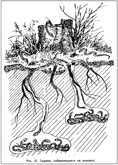 До затопления пойм Волги и Камы гадюки встречались там местами в больших количествах, особенно весной в период половодья. В это время в узкой, 10—20 м шириной, полосе между полоем и склоном материковой террасы можно было встретить до 24 гадюк на 1 км маршрута. В последние годы по берегу водохранилища редко встречается более двух гадюк на 1 километр. Обитают гадюки в поймах Вятки, Белой, Свияги и других рек и по материковым лесам на всей территории Татарии, включая и остепцрнные районы Закамья и Предволжья. Чаще у нас встречается черная форма обыкновенной гадюки, имеющая иногда желтоватую или красноватую окраску кончика хвоста и (редко) горла. Типичная для Западной Европы светлоокрашенная форма с темной зигзагообразной полосой вдоль спины попадается значительно реже, хотя молодые гадюки, как правило, имеют такую расцветку. Весной гадюки появляются в конце апреля — начале мая и в первые дни греются на солнечных местах — пригорках, пнях и т. п., не отползай далеко от зимних убежищ. Через несколько дней начинается спаривание, и в это время они встречаются парами или группами, как ужи, когда около одной самки, отличающейся большей длиной и более массивным телом, держится до четырех самцов. В августе самка откладывает до 14 яиц, из которых тут же появляются молодые длиной 17—19 см. Однажды мы наблюдали, как самка, медленно проползая через развилку куста, как бы выдавливала из себя яйца, которые при падении лопались, и молодые сразу расползались. На зимовку гадюки обычно уходят в сентябре и иногда собираются по несколько десятков в убежищах ниже границы промерзания почвы. Питается обыкновенная гадюка мелкими млекопитающими — землеройками, мышами, полевками, а также ящерицами и различными амфибиями, главным образом лягушками. В ее пище также встречаются и птенцы птиц, гнездящихся на. земле и низко над землей. Так, по наблюдениям Р. А. Зацепиной, в Сараловском участке Волжско-Камского заповедника, где после затопления поймы уменьшилась численность мелких млекопитающих, стали отмечаться случаи разорения гадюками гнезд серой славки, садовой камышевки и соловья. Случаи укусов гадюками людей в Татарии сравнительно редки и в подавляющем большинстве заканчиваются благополучно, несмотря на распространенные до сих пор неправильные методы лечения. Не рекомендуется перевязывать укушенную конечность, разрезать ранку, прижигать место укуса,— все это приносит только вред.. Не дают положительного результата и такие лечебные меры, как, например, введение под кожу марганцовокислого калия и некоторых других веществ. Следует постараться отсосать кровь из ранки губами; по данным специалистов, для отсасывающего это не представляет опасности, кроме тех редких случаев, когда имеются свежие ссадины на губах и небе. Хорошо принимать внутрь большие .дозы чая или кофе. Лучшее средство лечения—специальная сыворотка, которая должна иметься в медицинском учреждении. Из других лекарств рекомендуются препараты, поддерживающие сердечную деятельность. Из яда змей, особенно гадюк, фармакологическая промышленность производит сыворотки и ряд ценных препаратов (випралгин, випраксин, випротокс и Др.). Поэтому все ядовитые змеи, в том числе и наши гадюки, подлежат охране. К классу птиц относятся животные, тело которых покрыто перьями. Размножаются они путем окладыва