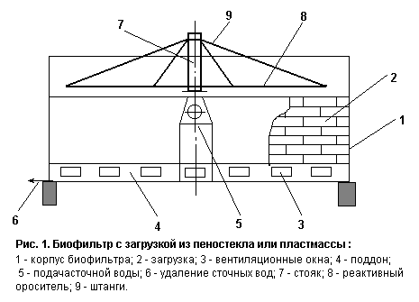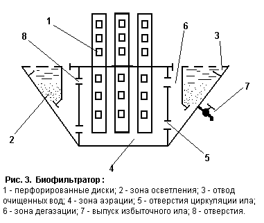 Современные биодисковые фильтры представляют собой многосекционную емкость, наполненную вращающейся загрузкой (Рис. 2). Диски набирают на горизонтально расположенном валу с расстоянием между ними 15-20 мм. Диски обычно погружены в очищаемую жидкость на 0,45Д (30—45 %), иногда до 0,75Д. Диаметр дисков находится в пределах от 0,4 до 3,0 метров в зависимости от производительности установки. Принцип действия данного сооружения следующий: диски - основной компонент сооружения - находится в постоянном вращательном движении, причем их поверхность перфорации покрывается биопленкой, которая находится в прикрепленном состоянии. Биомодули, создавая обширную поверхность, обеспечивают гидродинамические условия, при которых отторгнутая биопленка продолжает работать, находясь во взвешенном состоянии. Здесь совмещается режим работы прикрепленного биоценоза и взвешенного (активного) ила. За пределами зоны очищаемой воды микроорганизмы, находясь в биопленке, получают кислород непосредственно из атмосферы. При одинаковых категориях обрабатываемых городских сточных вод и заданном эффекте очистки время аэрации в БДФ составляет 60-90 минут, а в классических аэротенках - около 6 часов. Биодисковые фильтры компактны, конструктивно просты, устойчивы к различного рода перегрузкам, имеют низкие удельные энергозатраты. Кроме того, при использовании этих фильтров практически отпадает необходимость насосной станции, так как гидравлические потери сооружений не значительны. Биодисковые фильтры - многосекционные сооружения (3-6 секций). Основная масса удаленных биоразлагаемых загрязнений приходится на первую и вторую секции БДФ. Процесс снижения аммонийного азота и нитрификации успешно протекает в третьей и последующих секциях. Удаление азота достигает 40 %, что выше, чем в классических биофильтрах и аэротенках. Однако в очищенных водах присутствуют азотистые соли (биогенные соединения), поэтому в некоторых случаях требуется доочистка. Из биодисковых фильтров биологическая пленка потока обработанной жидкости выносится во вторичный отстойник. Разделение биопленки осуществляется гравитационным способом. Вторичные отстойники рекомендуется оборудовать тонкослойными модулями. 3.3. Биофильтраторы Компактная установка биофильтратор предназначена для малых расходов сточных вод (от 2 до 600 куб.м в сутки) и обеспечивает полную биологическую очистку от разнообразных загрязнений в широком диапазоне концентраций. Установка имеет низкие капитальные вложения и энергетические затраты. Она проста и экономична в эксплуатации, не требует специального постоянного ухода.Биофильтратор (Рис.3) состоит из аэрационной (сорбционной) зоны и зоны осветления.