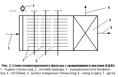 Пеностекло имеет чрезмерно развитую поверхность, удерживает в единице объема большое количество биопленки, чем какой-либо другой вид загрузочного материала, что способствует интенсивному изъятию загрязнений из сточных вод. Распределение сточной воды по поверхности биофильтра осуществляется с помощью реактивного оросителя (Рис.1). Пластмассовые загрузки используются в виде жесткой (кольца, обрезки труб и т.д.), жестко-блочной (из плоских и гофрированных листов), а также мягкой (из пластмассовых пленок) засыпки. Таким образом, загрузка обладает высокой пустотностью, большой сорбционной поверхностью и относительно малым коэффициентом сцепления биопленки с поверхностью загрузки, что создает условия для образования тонкого слоя биопленки. Пластмассовая загрузка исключает заиливание биофильтров, значительно увеличивает объем поступающего воздуха, что способствует повышению окислительной мощности. Кроме достоинств, биофильтры обладают и рядом недостатков. Так, высокая не равномерность поступления сточных вод от малых объектов крайне отрицательно влияет на работу биофильтров и аэротенков. В биофильтрах происходит подсыхание биопленки и наблюдается не равномерность температурного режима ее работы, создаются условия, способствующие заиливанию загрузки. Во избежания этих явлений в часы минимального притока сточных вод осуществляют рециркуляцию очищенных сточных вод, что приводит к дополнительным энергозатратам на перекачку стоков. 3.2.Биодисковые фильтры Эти сооружения предназначены для расхода сточных вод до 1000 куб.м в сутки. В качестве загрузки для биодисковых фильтров рекомендуются перфорированные диски, изготовленные из объемных синтетических материалов пониженной плотности (пенопласта, пеностекла).