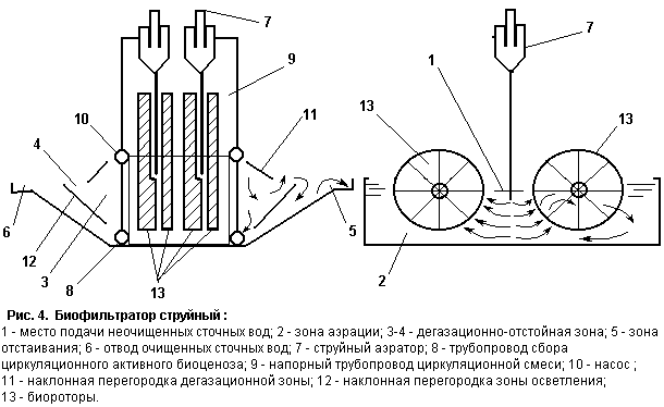 В сорбционной зоне установлены вращающиеся перфорированные диски из пенопласта или подобных материалов. Диски вращаются мотор-редукторм с частотой вращения 10-15 об/мин. За счет градиента давления жидкость и отторгнутая биопленка переливаются через отверстие, устроенное в разделительной перегородке. Укрупненные хлопья активного ила из зоны осветления опускаются вниз и через отверстия подсасываются в аэрационную зону за счет кинематики течения. Таким образом, происходит постоянный обмен биомассы между зонами сорбции и осветления. Очищаемая жидкость поднимается к лотку и отводится за пределы сооружения. Для интенсификации биотехнологии в биофильтре используется струйная аэрация (Рис. 4), что позволяет исключить механическую систему привода мотор-редуктор. Такой метод очистки применяется дла расходов сточных вод от 0,5 до 1,5 куб.м в сутки и более, с загрузкой от низких до высоких значений концентрации биоразделяемых соединений (БПК).