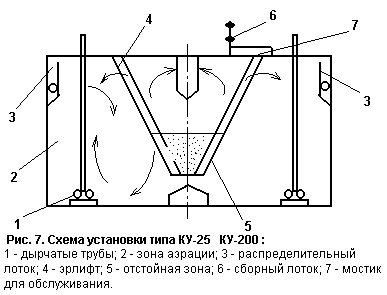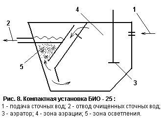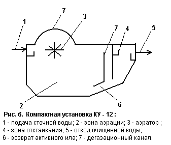 Для предотвращения осаждения взвешенных веществ в лоток подается сжатый воздух. Из распределительных лотков через отверстия с регулируемыми треугольными водосливами сточная вода переливается в аэротенк-отстойник. Аэрационные зоны расположены по продольным стенкам. Воздух в аэрационную зону подается от воздуходувок по воздухопроводам и распределяется через дырчатые трубы. В аэротенка возможно применение эжекционной аэрации. Отстойная зона расположена в центре установки. Смесь сточных вод и активного ила поступает в зону через нижнюю щель, проходит через взвешенный слой, образованный активным илом, где происходит разделение активного ила и очищенной сточной жидкости. Последняя поднимается к поверхности отстойной зоны, протекает через затопленные отверстия в сборный лоток и по нему отводится из установки. Активный ил увлекается потоком в бункеры отстойной зоны и перекачивается лифтами в аэрационные зоны. Избыточный активный ил периодически (1 раз в 1-4 месяца) удаляется из аэрационных зон на иловые площадки. Компактные установки КУ-12 - КУ-200 прошли длительные испытания на многих очистных станциях, качество очищенного стока БПК и взвешенным веществам составляет 12-15 мг/л, концентрация аммонийного азота снижается на 40%. Эффективность очистки сточных вод на этих сооружениях повышается, если во вторичных отстойниках использовать тонкослойные модули.