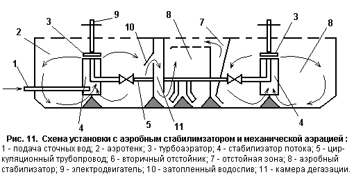 На рис. 10 показана схема компактной установки (КУ) с аэробной стабилизацией или пневматической аэрацией. Сточная вода, пройдя решетку-дробилку, установленную вне блока, и песколовку, поступает в падающий лоток с четырьмя треугольными регулируемыми водосливами и подаются в аэротенк. Аэротенк - квадратный в плане резервуар, по дну которого положены четыре плети перфорированных труб диаметром 150 мм. Аэротенк расчитан на продолжительность пребывания в нем сточных вод в течении 9 часов в часы максимального притока. С противоположной стороны аэротенка имеются затопленные окна для подачи сточных вод в отстойник. Отстойник - вертикально типа. В нем устанавливается перегородка, направляющая поток жидкости в нижнюю зону. Сборные лотки осветленной воды выполняют с регулируемыми треугольными водосливами. Осветленная сточная жидкость поступает из вторичных отстойников на сооружения доочистки и обеззараживания. В отстойнике имеются шесть приемников, каждый из которых снабжен эрлифтом с трубопроводом возврата активного ила в аэрационную зону; три приемника имеют эрлифты с трубопроводами, направленными в стабилизатор. Вдоль отстойника расположен мостик для обслуживания, куда вынесены вентили управления эрлифтами. Продолжительность пребывания стоков в отстойнике 1,5 часа. Поступление в стабилизатор свежих порций активного ила вызывает одновременное отделение такого же объема воды в отстойной зоне стабилизатора, которая отводится вместе с очищенными сточными водами из установки. Выгрузка из стабилизатора обработанного активного ила производится при достижении в нем предельной концентрации ила. Период выгрузки составляет 7-10 суток. Очистка стоков на это установке осуществляется без первичного отстаивания, БПК очищенного стока составляет 15 мг/л. На рис.11 показана схема установки с аэробной стабилизацией активного ила и механическими аэраторами. Эти сооружения выполняют в блочном варианте что позволяет набирать необходимую производительность (700-400 куб.м в сутки и более).